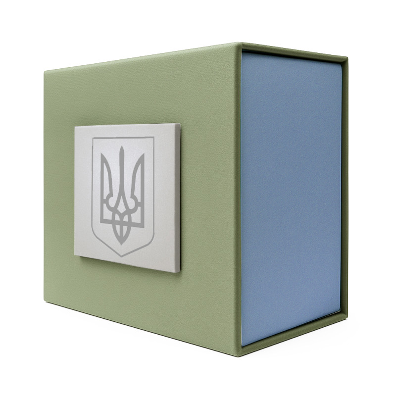 Подарункова картонна коробочка для годинника зелено-блакитна тризуб срібло